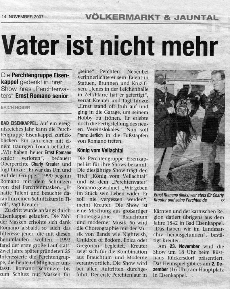 Zu dritt wurde anfangs durch Eisenkappel gelaufen. Die Zahl der Masken erhöhte sich dank Romano alsbald, so auch das Interesse jener, die mit diesen herumlaufen wollten. 1993 fand der erste große Lauf statt. Zwei Jahre später gründeten 25 Interessierte die Perchtengruppe, die heute 64 Mitglieder umfasst. Romano schnitzte bis zum Schluss nur Masken für "seine" Perchten. Nebenbei verinnerlichte er sein Talent in Statuen, Brunnen und Kruzifixen. "Jenes in der Leichenhalle in Zell/Pfarre hat er gefertigt", verrät Kreuter und fügt hinzu: "Ernst stand oft früh auf und ging in die Garage, um seinem Hobby zu fröhnen. Er erlebte noch die Fertigstellung des neuen Vereinslokales." Nun soll Franz Jerlich in die Fußstapfen von Romano treten.